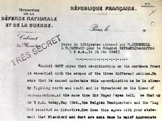 "أبرق إليّ الجنرال "غورت"، يخبرني بأن التنسيق بين الأمم الثلاث ضروري في الجبهة الشمالية. ويقول أنه ليس بإمكانه تحقيق هذا التنسيق مادامت جيوشه تحارب في الشمال والجنوب، وما دامت خطوط مواصلاته مهددة. ومن جهة ثانية أخبرني السير "رودجر كيس" أن القيادة البلجيكية وملك بلجيكا لم يكونا قد تسلما أية توجيهات حتى الساعة الثالثة من بعد ظهر اليوم 23 مايو، فكيف يمكن التوفيق بين هذا الواقع وما سبق وأكدتموه من أن "بلانشر" و"غورت" سيعملان يداً واحدة؟"