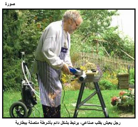 رجل يعيش بقلب صناعي، يرتبط بشكل دائم بأشرطة متصلة ببطارية