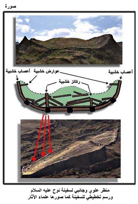 منظر علوي وجانبي لسفينة نوح عليه السلام ورسم تخطيطي للسفينة كما صورها علماء الآثار