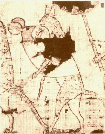 جزء من بردية، ترجع إلى عصر الرعامسة (البردية تصور منظراً هزلياً، يرى فيه قطة تضطلع بدور مربية لفأر طفل، ملفوف بحمالة، تحتضنه بحنان)