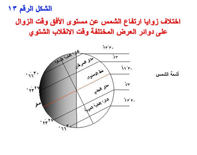 اختلاف زوايا ارتفاع الشمس عن مستوى الأفق وقت الزوال على دوائر العرض المختلفة وقت الانقلاب الشتوي