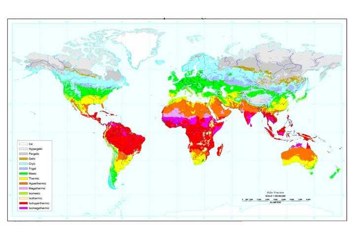 التوزيع الجغرافي لنظم حرارة التربة في النظام الامريكي(USDA-NRCS-NSSC)