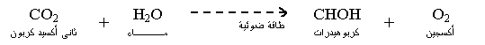 التمثيل الضوئي للكربوهيدرات، يتطلب سلسلة من التفاعلات الكيماوية الحيوية، المعقدة، التي يستخدم فيها الماء H2O وثاني أكسيد الكربون CO2، إلى جانب الطاقة الضوئية. ويمكن أن يكتب التفاعل الكيماوي للتمثيل الضوئي كما يلي: