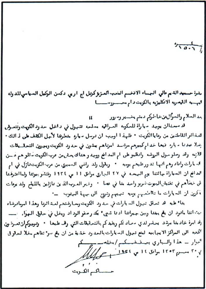 أصل رسالة من حاكم الكويت إلى الوكيل السياسي البريطاني في الكويت في 14 مايو 1934، في شأن انتهاكات العراق لحدود الكويت