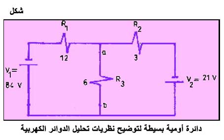 دائرة أومية بسيطة لتوضيح نظريات تحليل الدوائر الكهربية