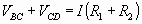 التيارI يمر في المقاومة R1، وهذا يعنى وجود فرق جهد كهربي بين طرفيها، من النقطتين B وC، وبتطبيق قانون أم، يكون فرق الجهد الكهربي بين النقطتين B وC هو: