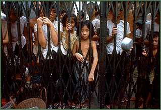 مجموعة من الأطفال اللاجئين في انتظار المساعدات المقدمة من مكتب المفوضية العليا لشؤون اللاجئين