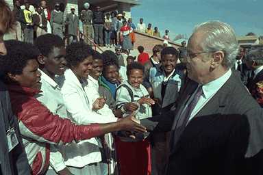فريق الأمم المتحدة للمساعدة في الانتقال في ناميبيا، الأمين العام للأمم المتحدة آنذاك بيريز دي كوييار أثناء زيارته لناميبيا عام 1989 قبل الاستفتاء الذي أشرفت عليه الأمم المتحدة
