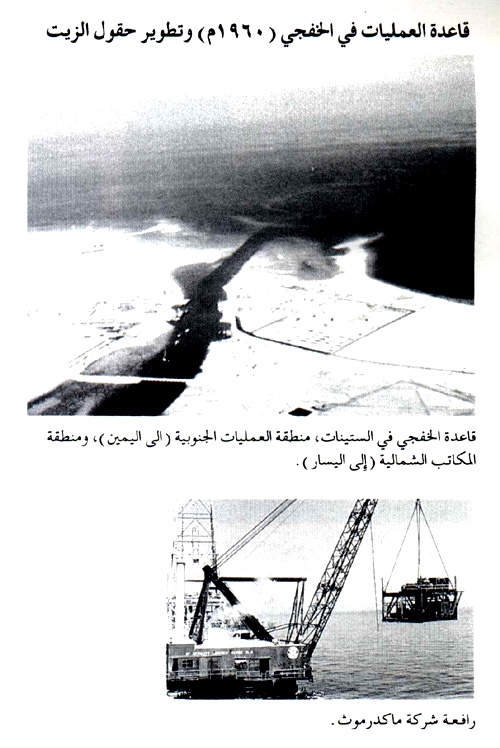قاعدة الخفجي في الستينيات، منطقة العمليات الجنوبية (إلى اليمين)، ومنطقة المكاتب الشمالية (إلى اليسار) - رافعة شركة ماكدرموث
