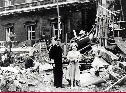 الملك جورج السادس والملكة إليزابيث (الملكة الأم، في الوقت الحالي) يتفقدان الدمار الذي خلفته القنابل بالكنيسة الخاصة، (معرض الملكة حالياً) في 10 سبتمبر 1940