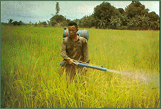 عامل زراعي أثناء استخدامه للمبيدات لمقاومة الآفات الزراعية، تعمل منظمة الفاو على المساعدة في مقاومة الآفات الزراعية