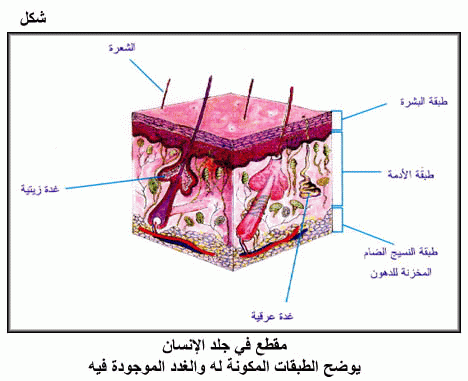 مقطع في جلد الإنسان يوضح الطبقات المكونة له والغدد الموجودة فيه