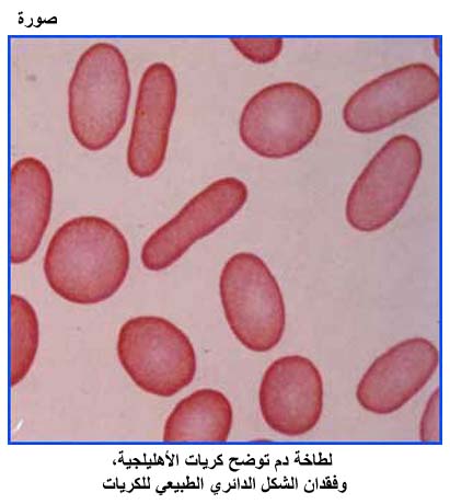 لطاخة دم توضح كريات الأهليلجية، وفقدان الشكل الدائري الطبيعي للكريات