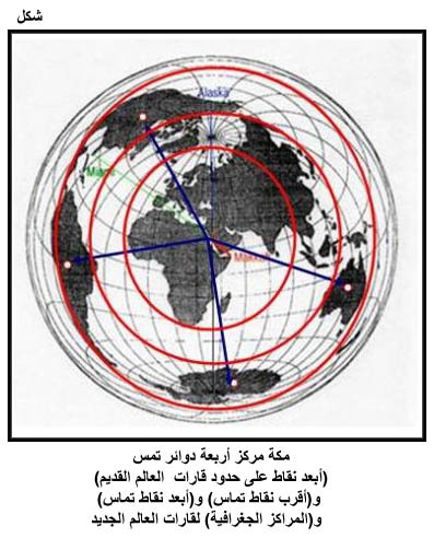 مكة مركز أربع دوائر تمس (أبعد نقاط على حدود قارات العالم القديم)، و(أقرب نقاط تماس)- و(أبعد نقاط تماس) – و(المراكز الجغرافية) لقارات العالم الجديد